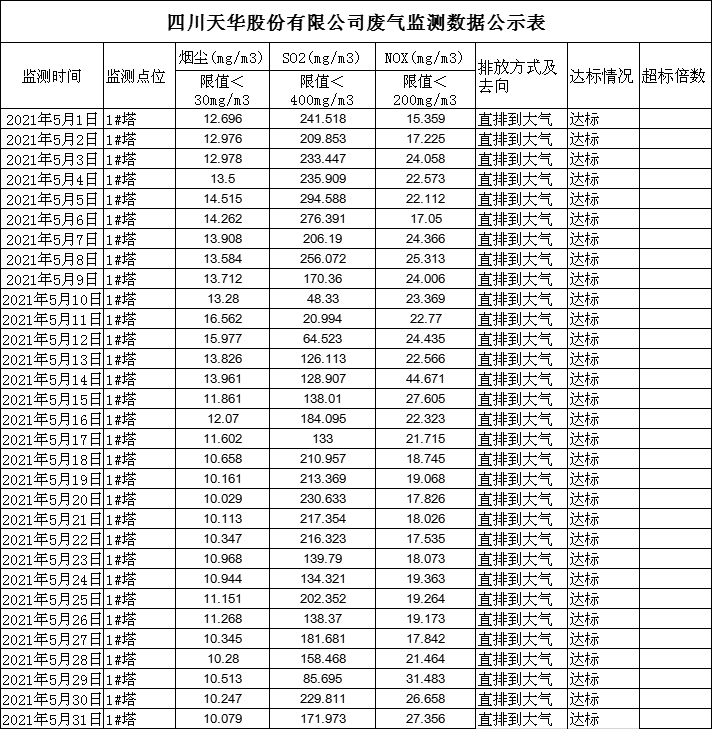四川天華股份有限公司5月廢氣監測公示
