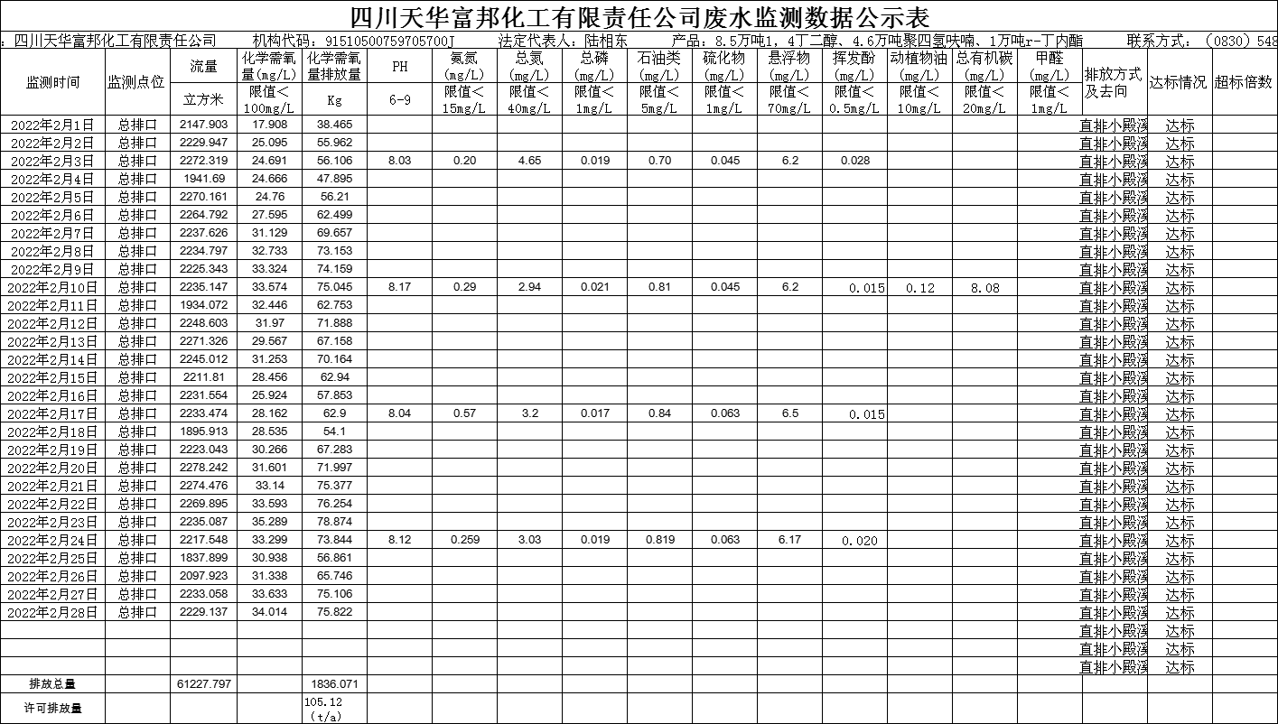 四川天華富邦化工有限責任公司2022年2月廢水監測數據公示