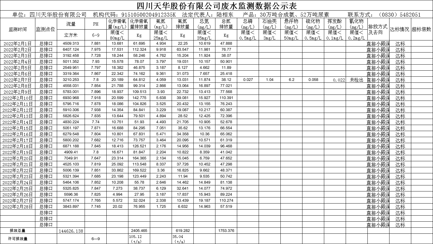 四川天華富邦化工有限責任公司2022年2月廢水監測數據公示